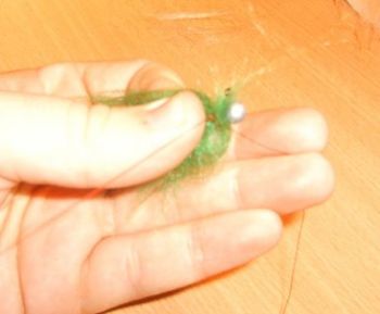 Step two tie the fur on the jig head using any not you prefer it does not matter as long as it gets on there.
