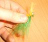 like green and yellow or blond and pink . I use pink to imitate blood in the water from an injured bait fish.