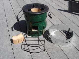 The stove is lined with ceramic and has what appears to be a cast iron top. The stove comes with a rack for your fuel and an adjustable pot ring to focus more of the heat. The ceramic brick on the left is an insert for the top opening, which closes off entirely, allowing one to use the coals as a charcoal burner. The bottom opening is closed in this pic.