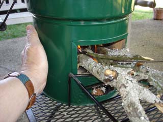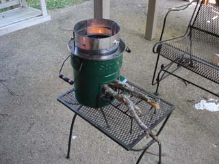 5 minutes and burning pretty good at this point. The metal rack allows you to feed the fuel and it does take some regular tending as you will see in a following picture.