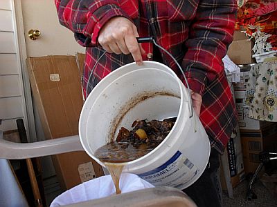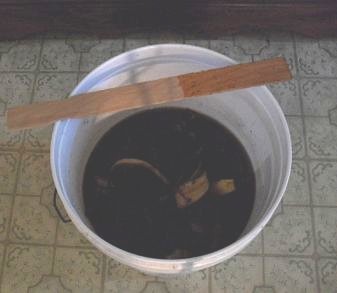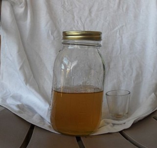 I hadn’t gardened in several years, but did like to have houseplants around and I thought it would be an economical way to fertilize them. But, as usual, life happened and I didn’t get around to really experimenting with the concept until recently. So, daughter and I began tossing fruit, vegetable peelings as well as egg shells and any other kitchen scrap we thought would be suitable into a five gallon bucket. When the bucket was about half-full, we added water to the ‘garbage.’ We stirred the mixture once or twice daily with a new wooden paint stirrer. A paint stirrer that had been used would probably not be a good idea. When the bucket contents had been marinating a little over a week, we strained the liquid through an old cotton cloth. The liquid filled an empty plastic coffee can, about 33 ounces. This compost tea should be mixed with ten parts water to one part tea per the instructions we used. For the illustration I used ten one ounce shot glasses full of water to one shot glass of compost tea.