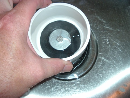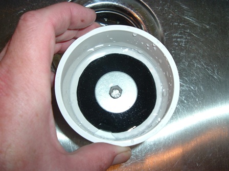 I tested the valve by filling the sink with water and slowly forcing the end cap into the water. This flapper valve works by uncovering the holes slightly when water pressure from the bottom is applied. In practice, the weight of the finished well bucket is enough to open the valve.