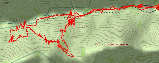 Let me brag on the Garmin E-map a bit.. We'd have been SCREWED without it several times... It's in a narrow valley so it starts getting dark at 3:30.. and it found THE one gap in a wash that didn't end as cliff... Otherwise we would still be out there on our hands and knees trying to get back up the mountain COVERED in dense mountain laurels.