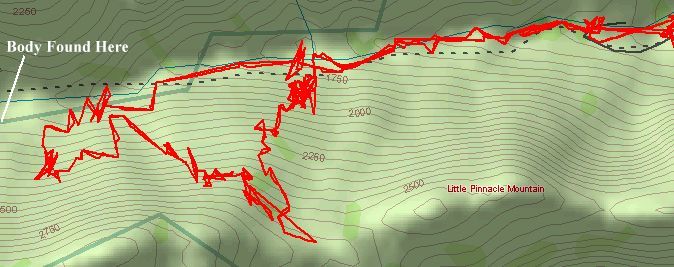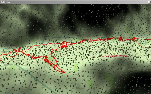 3-D map from above, looking down on the area we searched.. this is the info from MY GPS unit, with PaleHorse, another NASAR member and a park Ranger spread out to both sides of me)