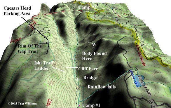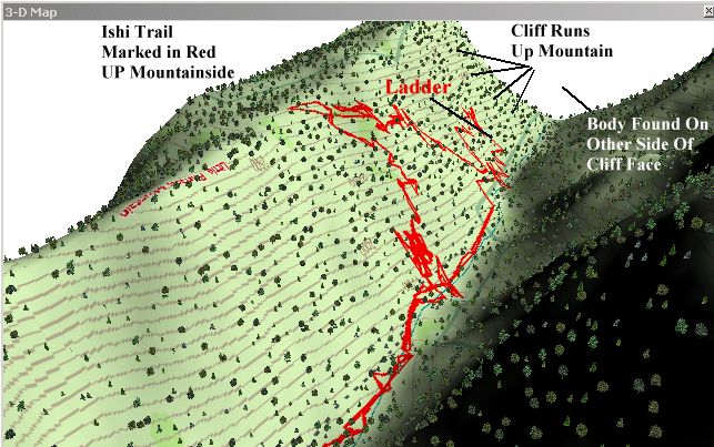Team 3 found the body just before noon today.. The victim was found WEST of the ladder at the bottom of a rock slide... there's no way he could have gotten there from the Ishi Trail...