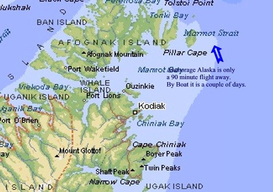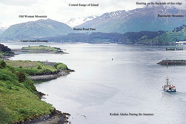 I had to search a lot to find this but it is a picture of Kodiak taken during the summer. The unusual warm snap had caused the area to look almost exactly like this. Very pretty day, warm (above freezing) and so inviting. Notice the mountains farther in towards the Central Range of the Island, also notice the sudden absence of snow on the closer slopes of the nearer mountains. They had been covered with snow the previous two days but the warm snap had caused all the snow to melt.