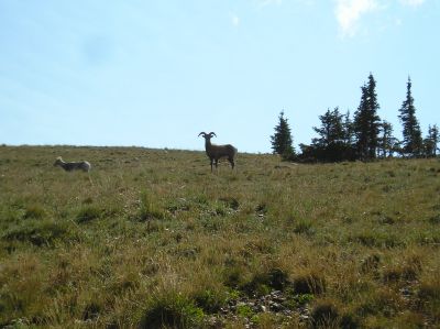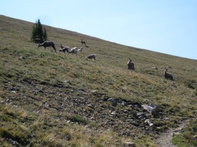 Along the way of the first leg, I encountered some very friendly medium-sized grey and black birds which competed for my trail mix at rest stops, an elk, some big horned sheep, a mule deer, several marmots and a hawk which occasionally circled overhead. The weather was exceptional - no clouds and a high of around 60 degrees during the middle of the day. Although the temp was not high, I was sweating pretty profusely because of the exertion. My synth t-shirt wicked off the excess moisture extremely well. My LL Bean Crestas were up to the task and also once again my physical conditioning was equal to the challenge.