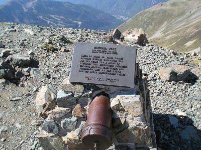 At that point I made the decision - I was going to make it to the top or die trying. Literally. I left my water bottle at Mt. Walter and I was completely unencumbered. Either I made the summit or someone would find my freeze-dried remains. So I started down and hiked nearly a mile farther until I realized I had passed the real summit! Painfully but hopefully, I started backtracking until I found a poorly marked trail which led me to the actual summit. For the first time I heaved a sigh of relief when I saw the marker and a cairn - Mt. Wheeler 13,161 feet. I milled around on the top for a while and signed the ledger and took a few photos. My mind cleared and weariness left me. It was time to break for camp and a good hot meal.