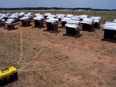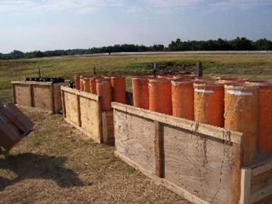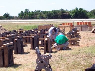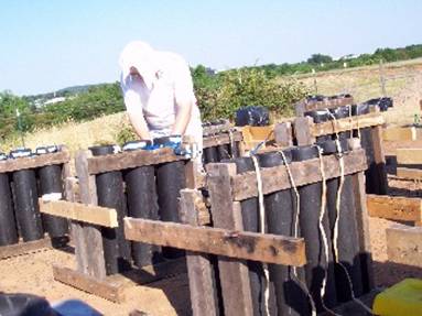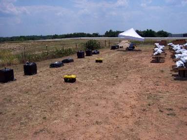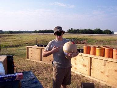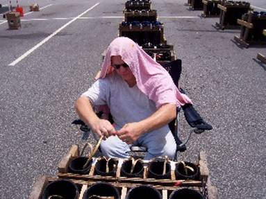 This crew of 5 has two simultaneous shows to shoot on the 4th. We’ve been on site since Tuesday and the show is Friday. Yea, it takes that long to set up these shows. Here’s some pics of the bigger show by the airport. This show is going to be choreographed to a soundtrack, which will be broadcast over the radio. Therefore we have to set it up according to a specification sheet. We are firing it electrically, which is safer than hand firing. Electric firing is necessary for choreography. We set the mortars up in “cues” and each one has a number designation. As each cue comes up on the sound track whoever is shooting simply hits that button on the firing board and away it goes. The people who designed the show to fit the sound track have done the hard work of figuring in any delays in the fuses and flight time so that once the shell launches, it reaches altitude and bursts at the right time. This show is supposed to last just under 15 minutes and will be filmed by helicopter. It is the biggest show in Greenville.