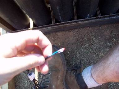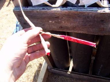 Once we had the 8, 10 & 12” mortars in the sand boxes and all of the 4, 5 & 6” racks in position it was time to start dropping shells. That’s slang for loading shells in to the mortar tubes. The electric match is what ignites the fuse. For liability reasons I won’t show how to actually connect the match to the fuse. DON’T try it!! This is extremely dangerous!